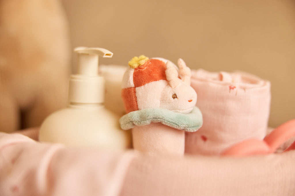 With a rattle toy, you stimulate your little one's fine motor skills and your baby also practices grasping objects. The little bell in the rattle toys makes a soft sound.