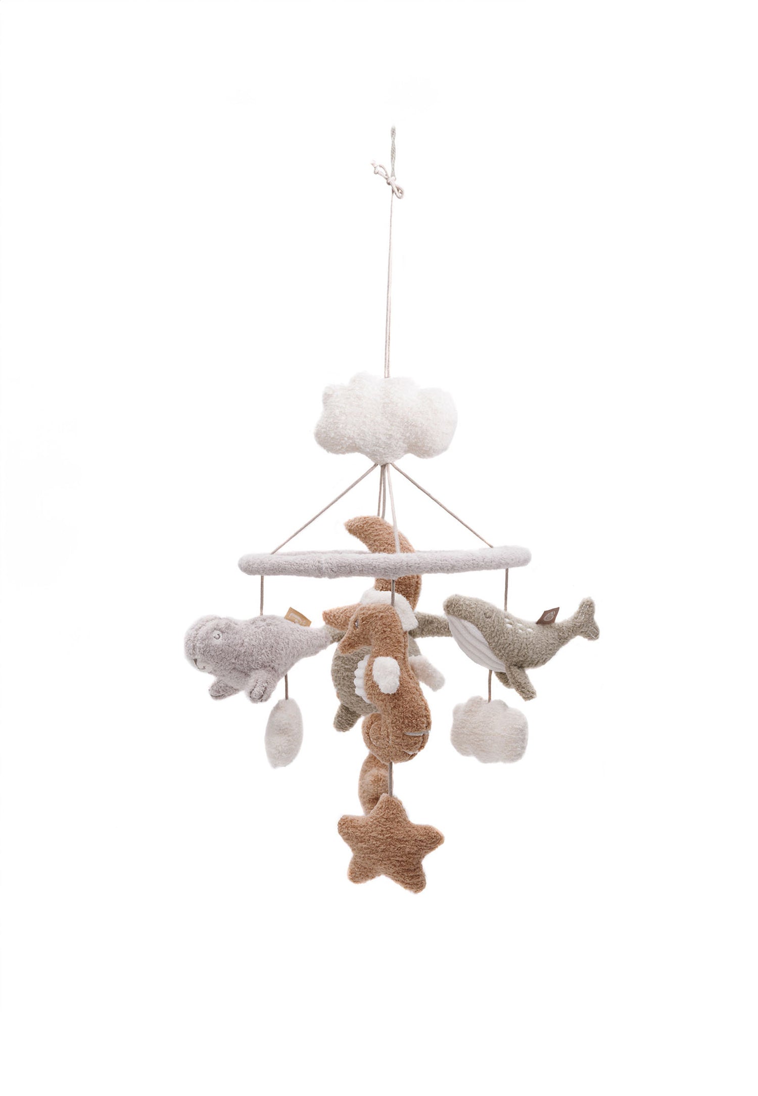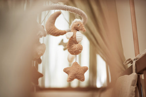 Show your little one the beautiful world of the ocean with our Deep Sea mobile hanger. This enchanting hanger is perfect to hang above the playpen and let your baby enjoy a sea of adventures. The mobile has a lot of ocean friends on it, such as whales, turtles and seahorses, together with playful shells, stars and moons. The various fabrics, including soft terry in the colours biscuit, olive green and oatmeal, will give your baby a wonderful sensory experience. Bring the deep sea straight to the babyroom and let your child be amazed by the underwater world with this beautiful mobile hanger.