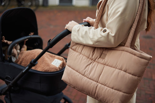 The perfect puffed mom bag! This bag is perfect when you're going on an outing with your little one. This bag is perfect for when you go on an outing with your little one. Of course, you can also use the bag for yourself, as a gym bag or a school bag. The bag is made of 100% recycled polyester, and it has a cute polka dot print on the inside. Furthermore, the inside offers 2 extra compartments and the bag comes with an included changing mat. The bag closes with a button and there is a zipper in the inner pocket. The bag has extra long handles, so that you can not just carry it on your shoulder, but also cross-body or on the stroller. Colour Available in the colour Biscuit, Black and Olive Green Material The outside is made of 100% recycled polyester. The filling of the bag is made of 100% recycled polyester puffed bag. Size The bag is 40 x 35 x 16 cm. The total length of the handles is 85 cm.
