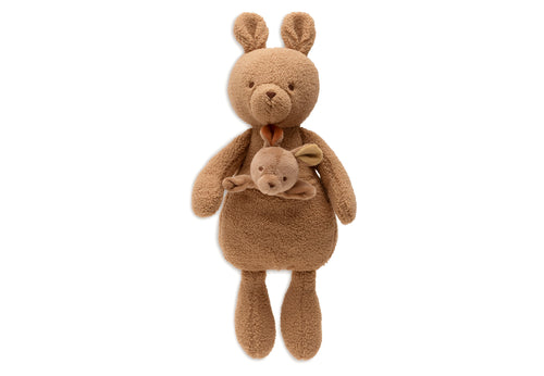 This Kangaroots stuffed animal shows how wonderful it is to be together. The large kangaroo carries her baby safely in the pouch, where it is snugly tucked in. You can take out the little kangaroo to play with separately or put it back in the pouch. The combination of coral fleece and velvet feels wonderfully soft. The little kangaroo has two different colored ears, adding a playful detail. A plush with a sweet extra, perfect for endless cuddles and play.