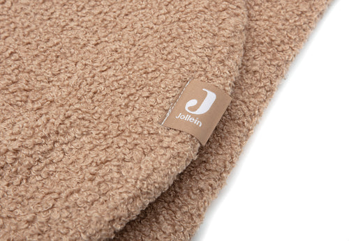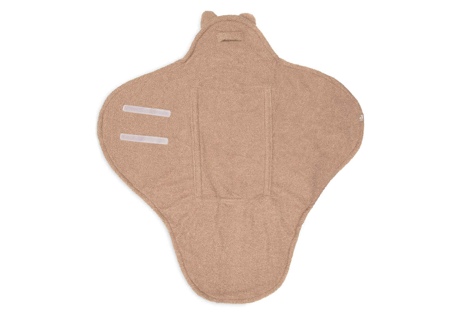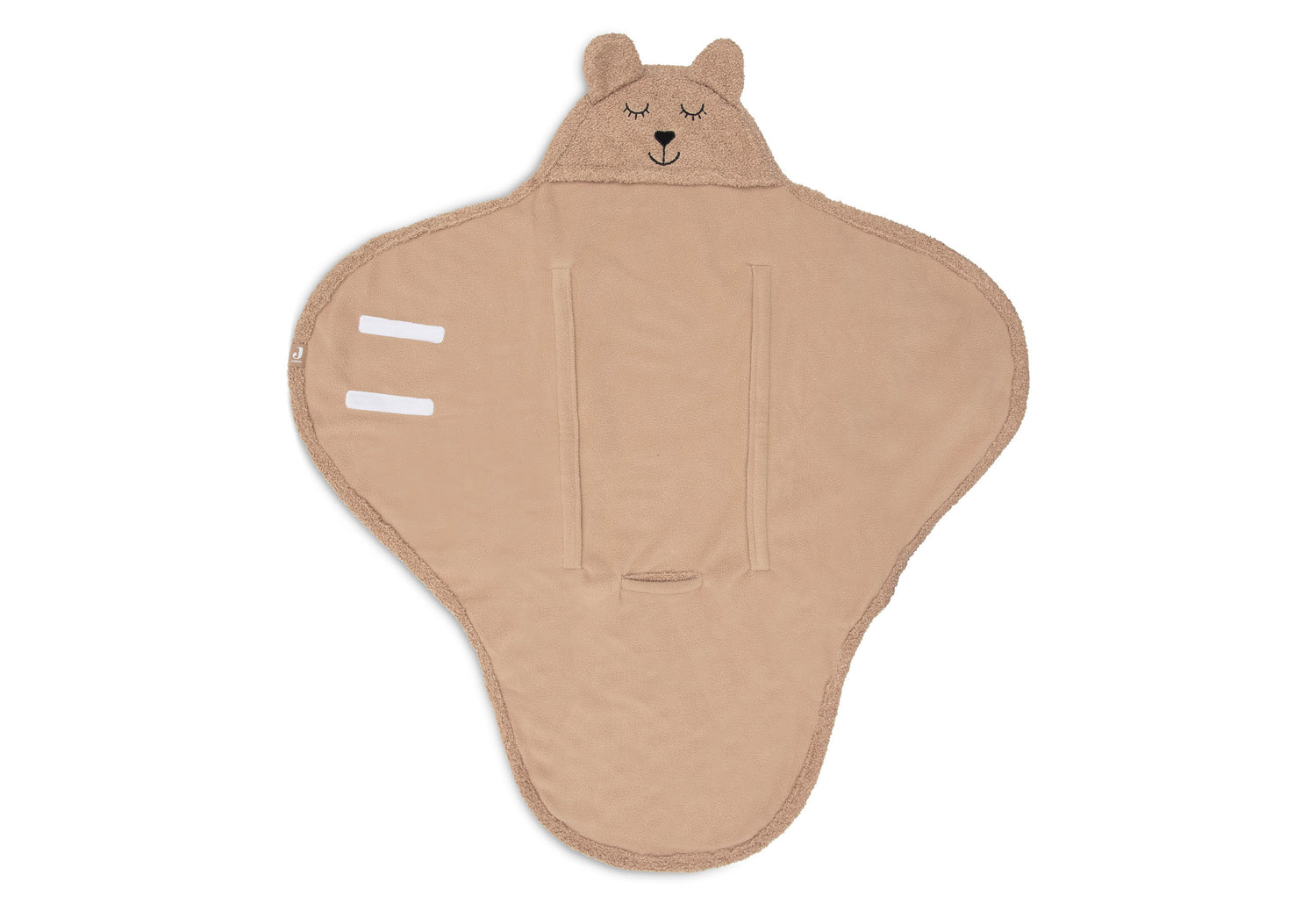 Wrap blanket with guaranteed mega cuteness factor. It has fluffy fur-look fabric on the outside, and it's super comfortably soft on the inside. Wrap your baby up and close the blanket with the practical velcro strips. Put the little hat on, with adorable little ears and a little bear face. Too cute! This wrap blanket can be used from birth. And it's also practical to use in your baby's first car seat. You can put the belts of the car seat through the openings in the blanket, so your baby can stay in their wrap. It's a universal wrap blanket for the Maxi Cosi and every other brand of category 0 cat seat with three or five point seatbelts. Available in various colours.