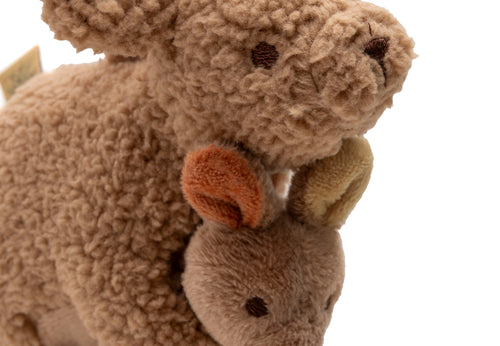Hoe lief is deze wagenhanger uit het Kangaroots thema! De zachte kangoeroe draagt haar baby veilig in de buidel, waar het stevig vastzit. Samen vormen ze een knus duo dat zorgt voor een gevoel van warmte en geborgenheid onderweg. Gemaakt van superzacht coral fleece en afgewerkt met fijne details, waardoor de hanger niet alleen schattig oogt maar ook heerlijk aanvoelt. Dankzij de handige ring bevestig je de wagenhanger eenvoudig aan de kinderwagen, zodat jouw kleintje altijd dit lieve kangoeroetje dichtbij heeft.
